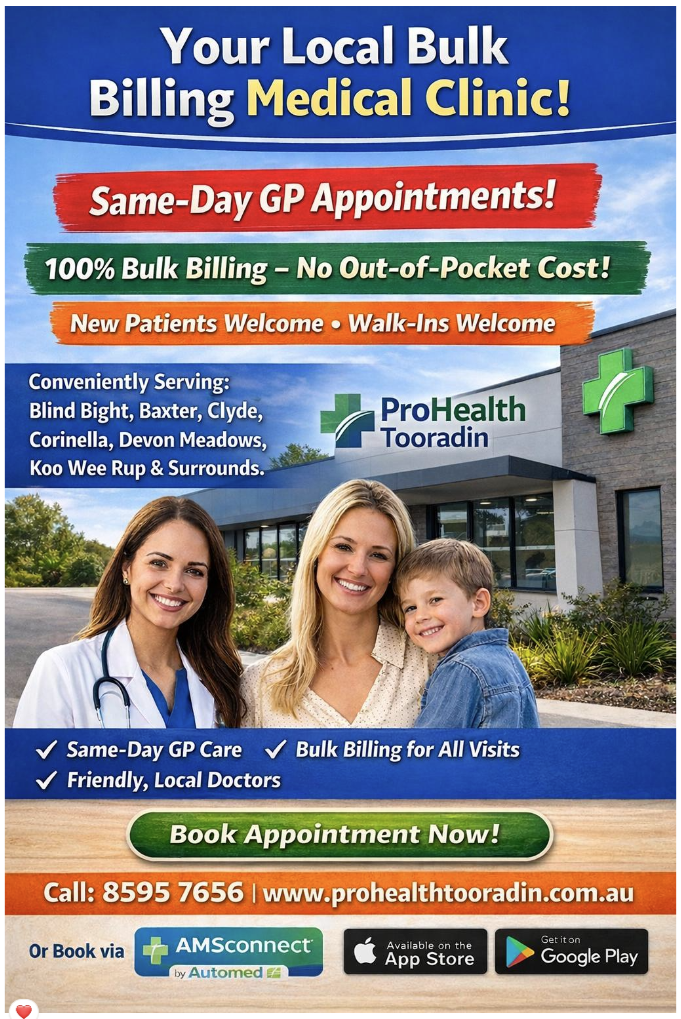 Located in the heart of Tooradin, ProHealth Family Medical Centre is dedicated to providing comprehensive healthcare services for individuals and families. As a fully bulk-billing practice, we ensure accessible and affordable consultations for all patients. Our team of highly experienced, Australian-trained General Practitioners is committed to delivering quality medical care in a welcoming and supportive environment.